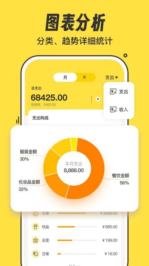 系统会自动将用户的收支按照餐饮、交通、购物等不同类别进行分类管理。用户可以根据自己的需求自定义分类,建立个性化的记账体系。清晰的分类让账目查询更加便捷,帮助用户快速了解各项支出的占比情况。