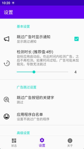 开屏跳过最新版在保持核心功能纯净的同时,优化了广告识别的响应速度。软件界面设计简洁直观,主要功能一目了然。默认4秒的广告检测时长经过精心调校,能在保证识别准确率的前提下实现最快跳过,用户也可以根据需求自定义这个时长。实际测试表明,软件对主流应用的广告拦截成功率高达95%以上,有效避免了误触跳转的困扰。智能关键词识别系统支持多语言匹配,能自动适应"跳过"、"关闭"等不同表述方式。软件还提供了详细的统计功能,让用户可以直观查看拦截记录和效果,这些贴心的设计细节都体现了开发者的用心。
