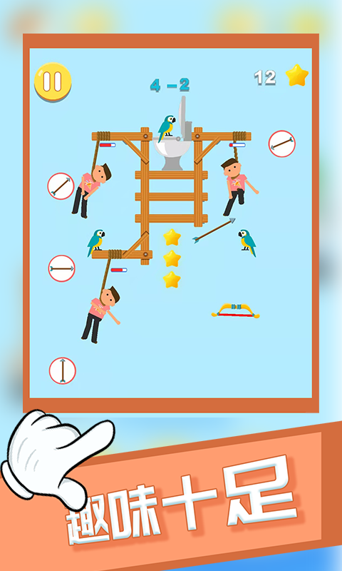 绳子摇摆的物理效果非常逼真,玩家需要仔细观察绳子摆动的轨迹,在最恰当的时机射出箭矢,确保小伙伴能够安全落地。