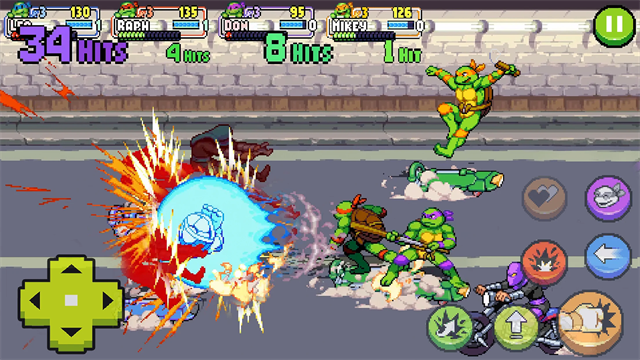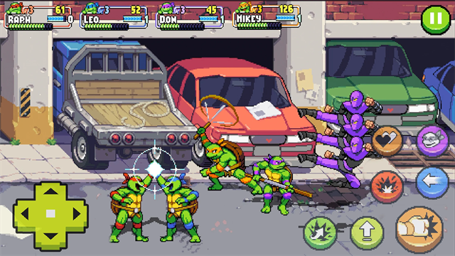 角色选择:玩家可从四只忍者神龟中选择其一,每只角色拥有独特的技能和连招。角色成长系统让玩家可以强化喜爱的神龟。
