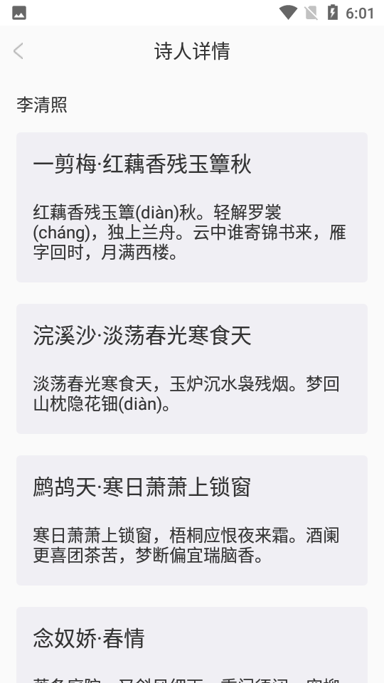诗词之美,时光洗练,精选中国唐诗、宋词、古文,为你提供一个干净清新的欣赏空间。软件采用智能分类系统,可按照朝代、作者、题材等多维度检索,让每首诗词都能精准匹配用户需求。收录的近30万首诗词均经过权威校勘,配有专业学者的注解译文,辅以高清古画背景,打造视听融合的典雅盛宴。从《诗经》的质朴到纳兰词的缠绵,完整呈现中华诗词的演进脉络,特别设计的"名篇精读"功能,通过语音朗诵与互动批注,让古典文学焕发新生。