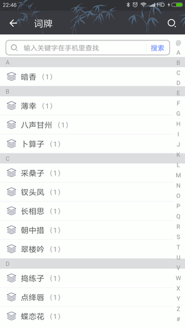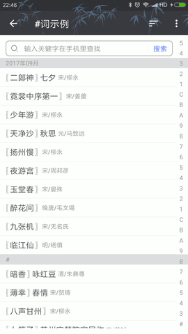 除了创作合律的唐诗宋词元曲,还可以用它写写打油诗,藏头诗,藏尾诗,回文诗,甚至对联,楹联等,满足各类文字游戏爱好者的需求。用诗词助手,作诗、填词、度曲和写对联不再如想像中那么难,亦不再是少数人的专利,通过循序渐进的教学模块,让古典文学创作变得触手可及。更为重要的是,该软件提供了自动的格律检测功能。当你在模版上输入一个汉字时,会自动的检测出是否符合规律。如果合律,字体显示为绿色;如何出律,字体显示为橘色;如果该字不在平水韵的范畴内,则保持蓝色,这种直观的视觉反馈大大提升了创作效率。诗词助手提供了常用的唐诗、宋词、元曲等模版,包括五言/七言的绝句/律诗、以及广为人知的六十多种词谱和七十多种曲谱。模版给出了字数,平仄以及韵脚,方便你用手机开始诗词创作,每个模板都配有创作要点说明和历史名作范例。