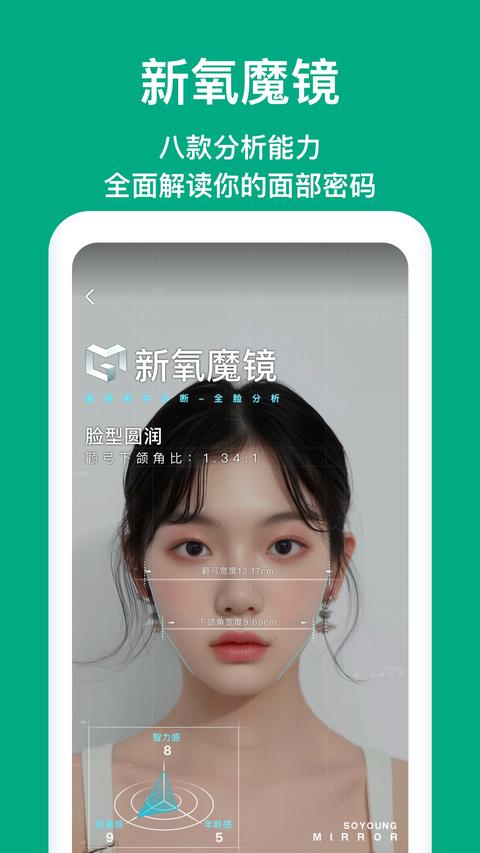 新氧魔镜基于AI技术的美学分析系统,可进行全脸8大部位精准诊断。