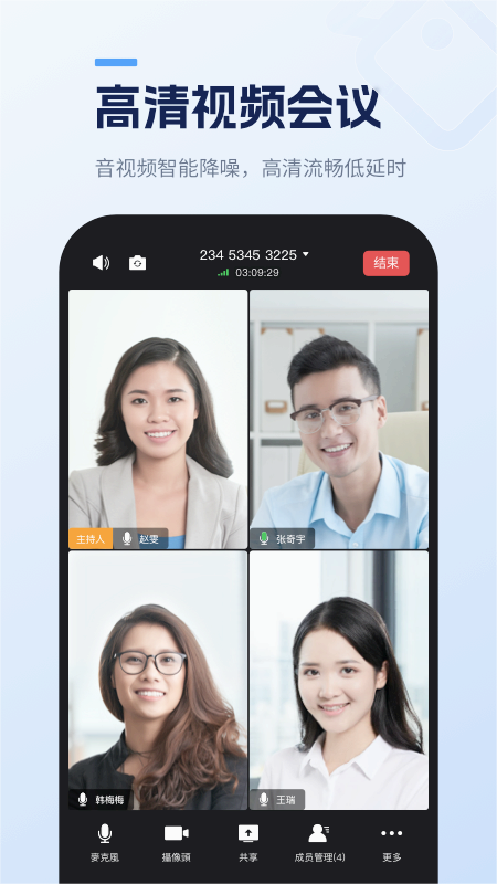 高清视频:采用先进的视频编码技术,在保证画质的同时优化带宽占用,为用户提供影院级的视频会议体验。