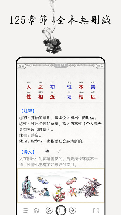 《三字经》作为中国传统文化的瑰宝,是最具代表性的启蒙读物之一。这部经典著作以简洁明快的三字句式,涵盖了文学、历史、哲学、天文地理、人伦义理等丰富内容,其核心思想"仁、义、诚、敬、孝"更是中国传统价值观的精髓所在。通过学习和背诵《三字经》,不仅能掌握基本常识,了解历史典故,更能领悟为人处世的道理。本软件由热爱国学的专业团队倾力打造,旨在帮助孩子们在轻松愉快的氛围中学习传统文化精髓。软件特别邀请"白云"老师进行专业朗诵,配有标准拼音标注、详尽注释、优美译文、深刻启示以及生动有趣的故事讲解,同时辅以典雅的水墨风格插画。此外,软件还提供实用的录音跟读功能,让学习过程更加互动有趣。我们衷心希望通过这款软件,能让更多家长、老师和学生共同感受国学智慧的魅力,传承中华优秀传统文化。