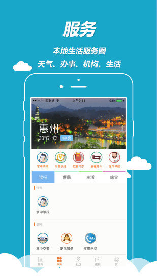 掌中惠州app是一款专为惠州本地用户打造的综合性资讯服务平台,由惠州掌尚传橙新媒体有限公司精心开发。作为惠州地区最具影响力的移动应用之一,掌中惠州致力于为用户提供全方位的本地生活服务。在这里,您不仅可以第一时间获取惠州本地的热点新闻和头条资讯,还能享受便捷的公共服务功能,包括医院挂号、违章处理、公共缴费等。同时,平台还汇聚了惠州本地优质的商家资源,为您推荐吃喝玩乐的好去处,让您轻松玩转惠州。无论是想了解城市动态,还是寻找休闲娱乐,掌中惠州都是您的最佳选择。