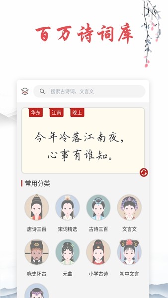 古诗词分类 提供了古诗词的分类标签,可以按照标签快速的查看古诗词内容,标签包括季节、情感、景物等二十余种。古诗词搜索 直接输入古诗词的名称、作者和关键词就能找到对应的古诗词了,支持模糊搜索和联想功能。古今名句 每天都会推送各种名句内容,在这里就能快速的进行记背了,名句库包含上万条经典语录。译文注释 可以查看古诗词的译文注释内容,这样就能提升用户对古诗词的理解,译文注重保留原作的意境美。文言文搜索 还拥有许多优秀的文言文内容,在平台也可以快速查找,包括《论语》《孟子》等经典篇章。古籍大全 这里还为用户整理了许多优秀的古籍,例如:孟子、礼记、周礼、左传等,每部古籍都配有白话译文和专家解读。
