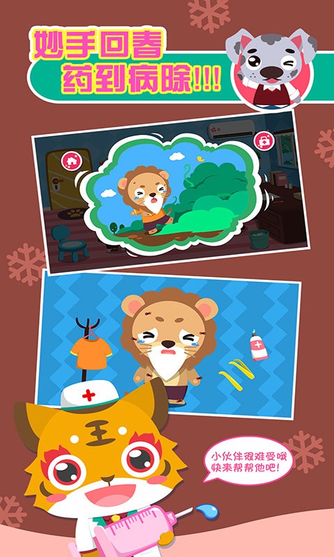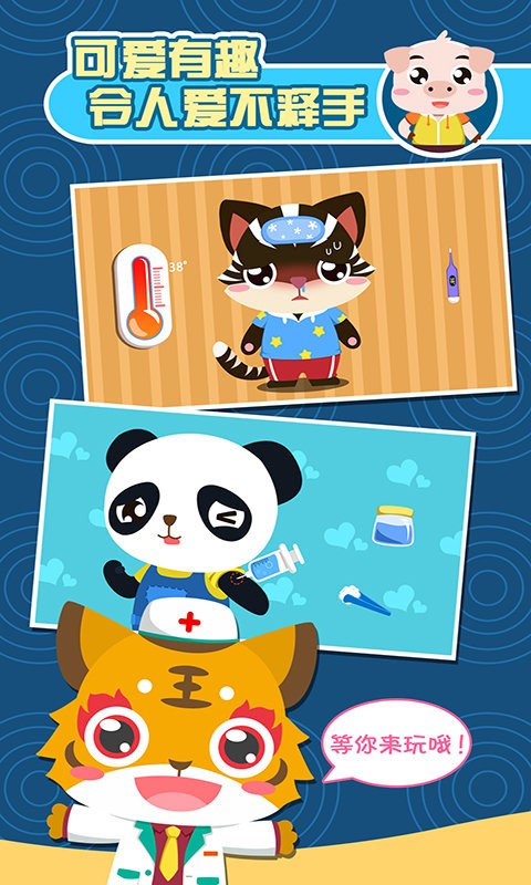 这款寓教于乐的游戏以温馨可爱的画风呈现,小朋友们将和比虎医生一起学习生活常识和医疗知识。游戏中设计了丰富多样的医疗场景,从简单的包扎伤口到处理各种常见病症,每个环节都充满教育意义。当小动物们来到诊所时,它们会详细描述自己的不适症状,小朋友需要仔细倾听,然后选择正确的治疗方式。比如给发烧的小兔子量体温、为骨折的小象打石膏、帮肚子疼的小浣熊开药等。通过这种互动体验,孩子们不仅能学到实用的医疗常识,还能培养责任心和同理心。