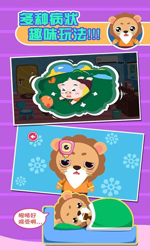 游戏最大的特色在于将知识学习融入趣味互动中。通过正确引导,帮助宝宝培养健康的生活方式。游戏中有超过20种可爱的动物病人,包括小兔子、小浣熊、小象、鳄鱼、小猴子、老虎等,每个动物都有独特的病症和故事。小朋友们可以实现当动物医生的梦想,在实践中运用学到的医疗技能。游戏模拟了30多种常见病症,如腹泻、骨折、头痛、感冒等,每种病症都配有详细的治疗流程。此外,游戏还特别设计了奖励机制,当小朋友成功治愈动物后,会获得星星奖励,大大提升了游戏的趣味性和成就感。