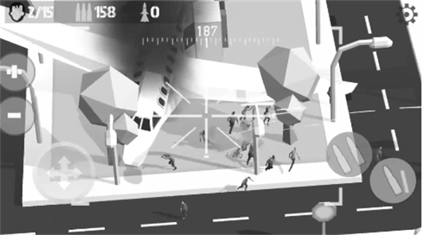 通过屏幕上展现出来的黑白画面去寻找僵尸的位置瞄准发出射击,消灭所有的僵尸来提升飞机的反应能力与等级。游戏采用智能瞄准辅助系统,让玩家可以更专注于战术决策。击毙僵尸会获得经验值和资源奖励,这些都是强化装备的重要材料。