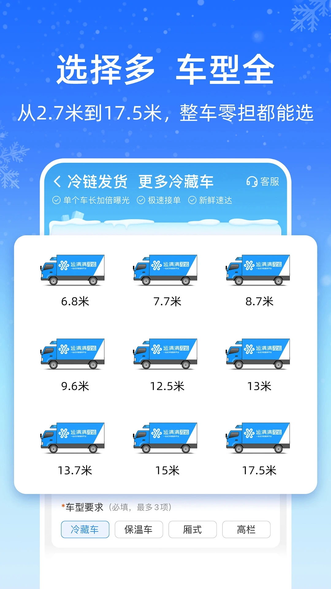 运满满冷运app是全国冷链发货的首选平台,覆盖果蔬、水产、冷冻品、冷藏品等多种货物类型。平台拥有百万优质冷藏车司机资源,能够快速响应您的发货需求。无论您是中小企业还是个体货主,都能在这里找到合适的运输方案。操作界面简洁直观,发货流程便捷高效,真正实现冷链运输的智能化、数字化管理。