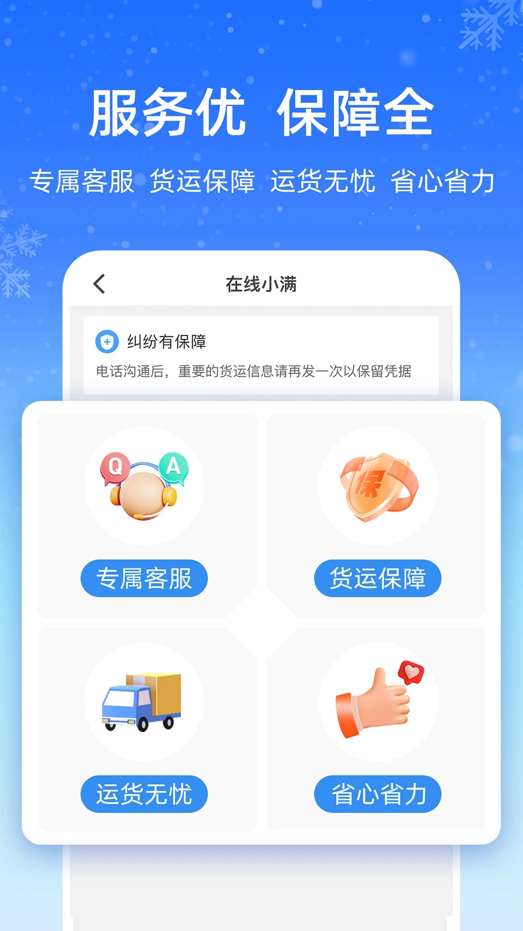 选择多:平台提供从面包车到大货车、从2米7到17米5的十几种车型选择,支持整车、专线、零担等多种运输方式,满足不同货物需求。速度快:百万优质司机24小时在线,一键发布货源后极速响应,确保货物快速送达目的地。服务好:提供精准货运路线规划,实时监控运输状态,全程温控保障货物品质,专业客服团队全程护航。更省钱:平台提供极具竞争力的运价,新人还可享受每月300票免费发货优惠,专属货运保障让您运输无忧。