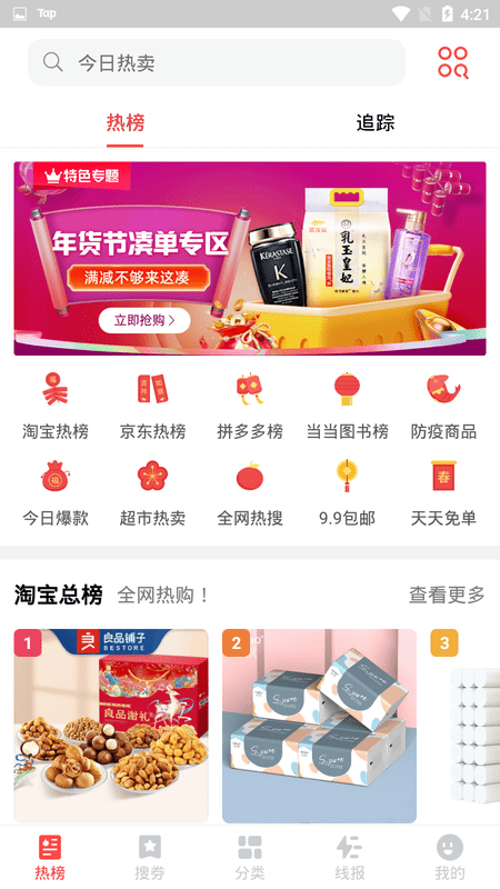 今日热卖是一款专为网购达人打造的优惠神器,汇聚了淘宝、京东、拼多多等主流电商平台的超值优惠信息。在这里,你可以轻松获取各类隐藏优惠券、限时秒杀和特价商品,享受前所未有的购物折扣体验。平台每日更新上万款精选商品,涵盖服饰、数码、家居等全品类,更有独家9.9包邮专区。智能比价系统能帮你一键对比全网价格,确保每一分钱都花在刀刃上。无论是日常购物还是大促囤货,都能让你省心又省钱!