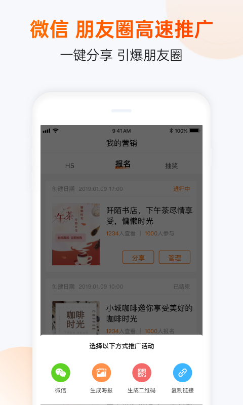 营销工具扩展:新增海报生成与分享功能,助力活动传播,扩大活动影响力。