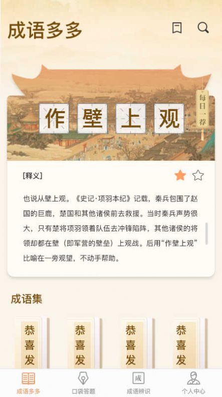 对于每个习语,软件都会给出相关例句并拓展知识,帮助用户更好地理解该习语的含义和用法,还会介绍成语背后的历史典故。每种答题模式都有相应的难度,有默读游戏、填空游戏、场景翻译等多种方式,这些游戏都经过精心设计,既考验知识又锻炼思维。提供关卡模式,将成语运用到生活场景中,提高用户学习和应用成语的能力,关卡设计贴近实际生活场景。