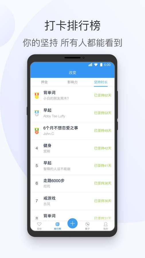 打卡排行榜,让你的坚持,每个人都可见证;通过公开透明的排名系统,用户可以互相激励,形成良性竞争氛围,共同进步。