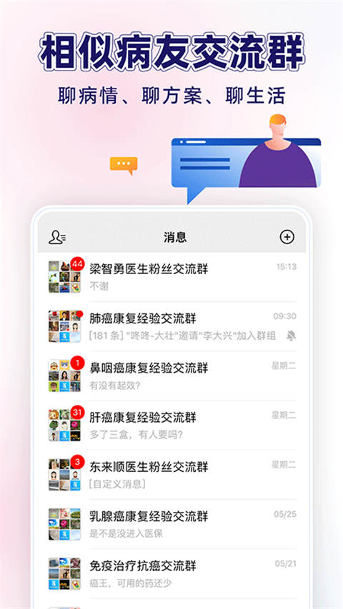 病友交流圈:按病种分类的专属社群,让用户可以畅谈治疗心得、交流生活经验,找到同病相怜的伙伴。