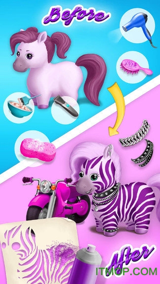 在这个充满魔法的小马发廊里,你将遇见活泼可爱的五小马姐妹——罗西、佐伊、彩虹、布兰妮和莫莉。每匹小马都有独特的造型需求:罗西渴望成为优雅的公主,佐伊想要炫酷的斑马造型,彩虹梦想化身梦幻独角兽,布兰妮追求流行明星范儿,而来自德克萨斯的莫莉则需要充满西部风情的装扮。游戏采用直观的触控操作,孩子们可以轻松使用各种美发工具,从基础护理到创意造型,完整体验发型师的工作流程。完成任务后别忘了打扫发廊,培养良好的整理习惯。