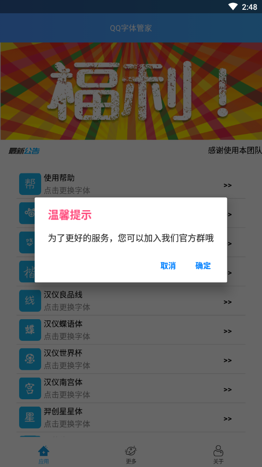 AAQQ字体管家app是一款专为QQ用户打造的个性化字体美化工具,提供海量免费字体资源。通过简洁直观的操作界面,用户可以轻松实现一键下载、快速替换,让聊天界面焕然一新。软件收录了200余款风格各异的精美字体,涵盖手写体、艺术体、卡通体等多种类型,每日更新不断,确保您的QQ聊天字体永远保持新鲜感。所有功能完全免费开放,无需任何会员订阅,让每位用户都能尽情享受字体更换的乐趣。