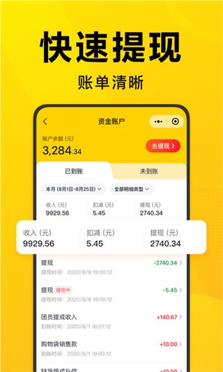 灵活资金管理:系统实时更新商品销售数据,收入明细清晰可见,团长可随时申请提现,资金秒到账且不收取任何手续费。