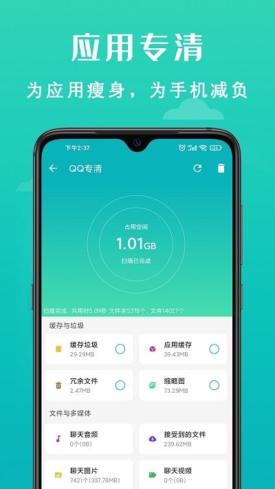 ·【手机瘦身】全面扫描分析手机存储空间,精准定位各类垃圾文件和大文件,让隐藏的垃圾无所遁形,彻底释放存储空间。