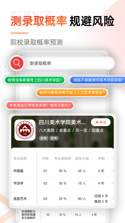 全面适配全国30个省份高考报考规则,根据艺考生独特的多批次填报方式,多维度快速匹配适合志愿;结合考生报考意愿和历年高校录取数据,根据人工智能和大数据算法生成志愿填报排序推荐,独家定制个性化志愿填报方案。新增志愿风险评估功能,智能预警填报风险。