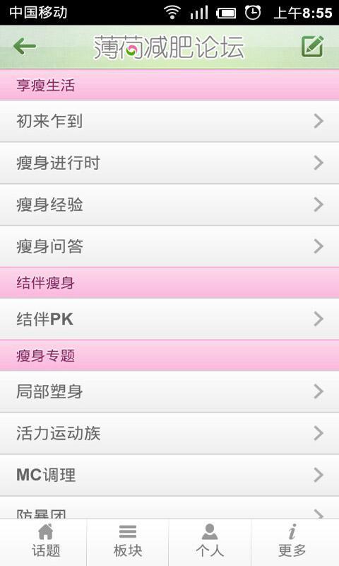 在薄荷减肥论坛,您可以获取全方位的减肥支持:从科学饮食指导到个性化运动方案,从心理建设到生活习惯调整,这里应有尽有。特别值得一提的是,平台拥有21个精心设计的专业板块,包括【瘦身进行时】、【瘦身问答】、【瘦身经验】、【结伴瘦身】、【局部塑身】等,几乎涵盖了减肥过程中可能遇到的所有问题。