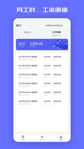 小时工记加班是南京陶陶网络科技有限公司专为灵活就业人群打造的一款智能工时管理应用。这款软件不仅能精准记录用户的加班时长,还能根据预设薪资标准自动计算应得报酬,彻底解决了传统手工记录容易遗漏、计算繁琐的痛点。特别值得一提的是,软件内置的月度工资结构可视化图表,让用户可以直观了解收入构成,包括基本工资、加班补贴等各项明细,真正做到工资透明化管理。无论是工厂临时工、钟点工还是兼职人员,都能通过这款应用轻松掌握自己的劳动所得。