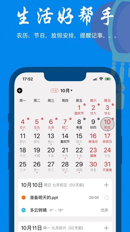 【爽】万年历查询支持前后100年范围,天气信息精确到小时级,节日提醒包含全球200+重要节日,所有功能都保持极简设计理念,拒绝复杂冗余。