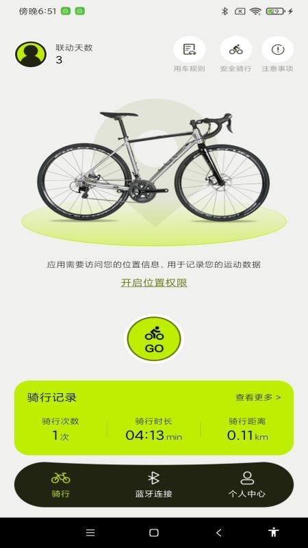 在线下载并打开共享单车骑行助手APP,就能打开蓝牙连接设备;首次使用会有详细引导教程,帮助用户快速熟悉各项功能。应用体积小巧,安装过程简单快捷。