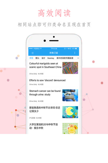 一览阅读拥有众多贴心功能,全面提升您的阅读体验:自动隐藏已读文章功能让界面保持清爽,支持批量标记已读大幅提升阅读效率;多种阅读模式任您选择,可以按时间线查看所有更新,也可以按主题或订阅源分类浏览;平台汇聚了数千个经过严格筛选的高质量内容源,涵盖科技、财经、生活等各个领域;支持订阅RSS、微信公众号、知乎专栏等多种内容来源,并可通过OPML文件快速导入现有订阅;离线下载功能让您在地铁、飞机等网络不佳的环境也能畅快阅读;收藏夹功能帮助您整理有价值的内容,一键分享到社交平台与好友互动;丰富的个性化设置选项,从字体大小到夜间模式,打造完全符合您习惯的阅读环境;多终端同步功能让您可以在手机、平板和Web端(www.yilan.io)无缝切换;社交账号一键登录省去注册烦恼;更支持将文章免费推送到Kindle等电子阅读器,保护您的眼睛。
