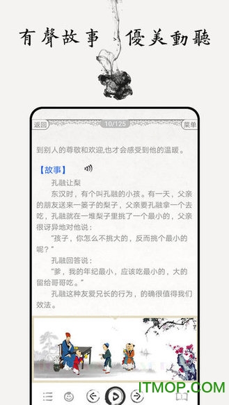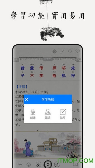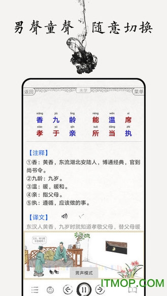 软件内容经过精心编排,每个章节都配有专业播音员"白云"老师的深情朗诵,确保发音标准、情感充沛。同时提供准确的拼音标注、详尽的注释解析、通俗易懂的白话译文,以及富有启发性的故事讲解。水墨风格的插画与整体UI设计相得益彰,营造出浓厚的传统文化氛围。录音跟读功能让学习更加互动有趣,帮助用户更好地掌握经典内容。
