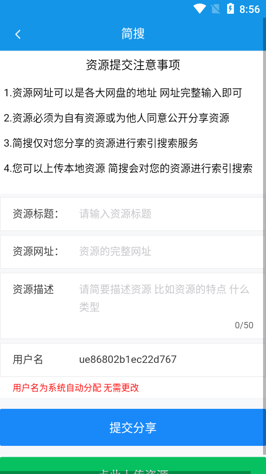 简搜app鼓励用户分享优质资源,但在提交时请注意以下事项:首先,资源网址可以是各大平台的地址,但必须确保网址完整有效;其次,提交的资源必须为自有版权内容或已获得授权允许公开分享的资源;第三,简搜app仅提供资源索引搜索服务,不存储实际资源内容;最后,用户还可以上传本地资源,简搜app会为这些资源建立索引,方便其他用户搜索使用。我们建议用户在上传资源时添加详细的描述信息,这样可以帮助其他用户更准确地找到所需内容。