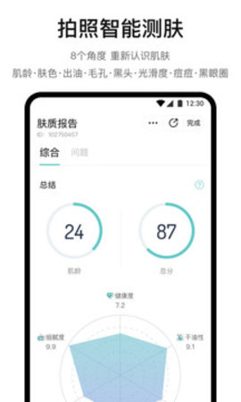 作为一款全能型护肤助手,软件主要提供三大核心功能:首先是专业级皮肤测试,通过手机摄像头就能完成多项指标检测;其次是深度肤质分析,生成包含改善建议的详细报告;最后是智能产品推荐,根据检测结果匹配最适合的护肤品。软件还定期更新护肤知识库,邀请皮肤科专家在线答疑,让用户不仅能了解"是什么",更能明白"为什么"和"怎么做",真正实现科学护肤。
