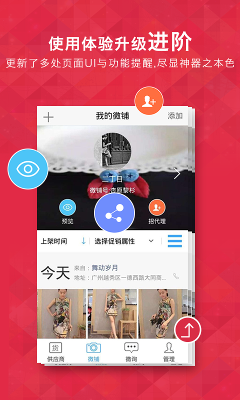 《微铺》是一款专为微商团队量身打造的高效分销管理软件,旨在帮助微商从业者简化工作流程、提升销售效率。通过这款软件,用户可以轻松实现商品信息的一键转发,将产品快速推广至微博、QQ空间等主流社交平台,大幅提升商品曝光率。同时,软件内置的智能管理系统让商品更新与管理变得异常便捷,让您的微商事业事半功倍。目前已有超过50万微商用户选择《微铺》,每天新增用户超过1万人,是微商团队不可或缺的得力助手。