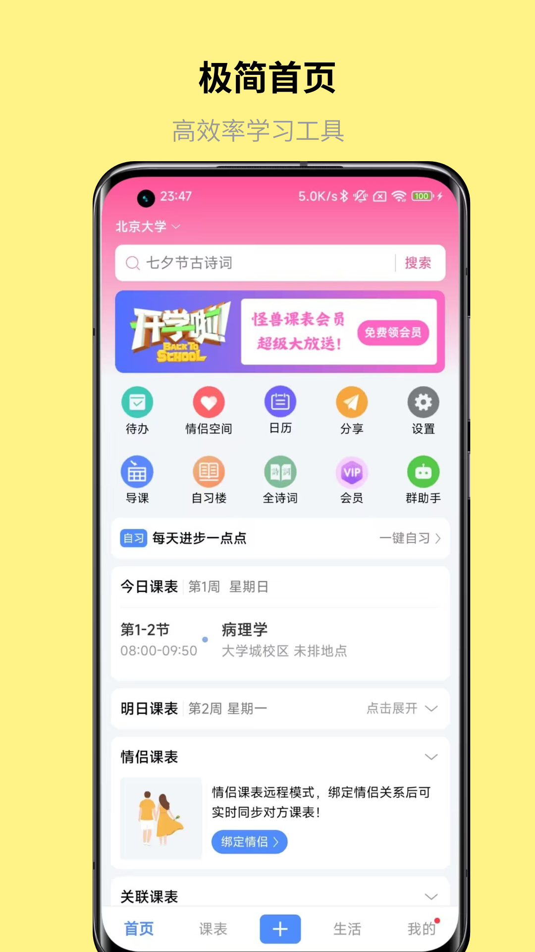 怪兽课表APP集成了多项实用功能,全方位满足学生的课表管理需求。软件内置海量精美课程模板,涵盖从小学到大学各个阶段,所有模板均可免费使用。强大的编辑工具支持课程信息的全方位管理,包括课程调整、备注添加、颜色标记等实用功能。课表展示支持多种视图模式,数据可视化程度高,重要信息一目了然。特别值得一提的是桌面小部件功能,无需打开APP就能在手机桌面查看当日课程安排。此外,APP还具备课程提醒、学习统计、备忘录等辅助功能,是学生管理学习日程的得力助手。