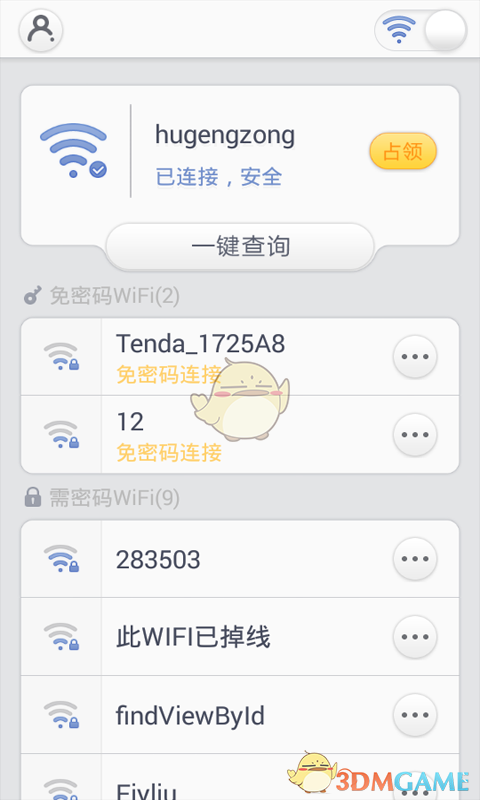实用wifi查询热点连接,点击自动查询周边用户分享的WiFi热点;智能排序功能会优先显示信号强、速度快的网络,让你获得最佳上网体验。