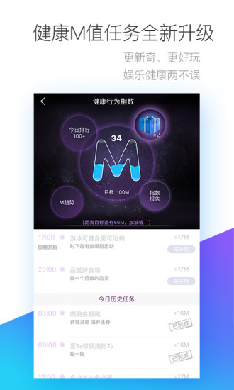 健康行为指数"M"值——国内首创以数值(星级)形式诠释健康行为的算法,实现全方位用户健康行为管理。让用户保持健康快乐的生活方式。该指数基于多项健康指标综合计算,直观反映用户的健康状况。