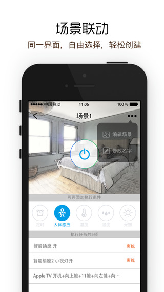 场景玩法,通过设置触发条件和执行任务,让多个家用电器联动起来,打造个性化智能场景;