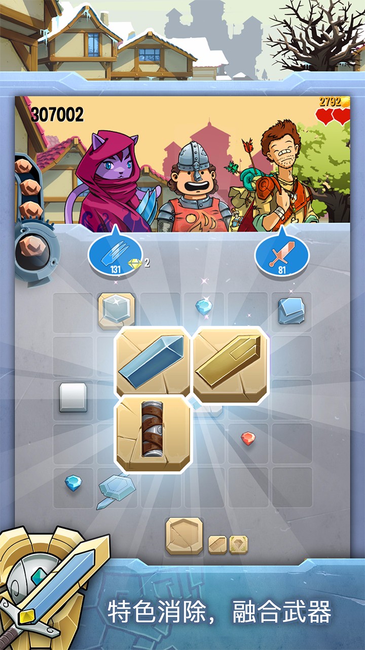 由于玩家在游戏中扮演的是一名铁匠,每天的工作就是打造兵器。而《铁匠迷情2》合理地利用了这个剧情,将消除玩法融入了铁匠的工作当中。具体来看,游戏格中元素有两种:矿石和模具。玩家需要把这两种材料打造成兵器,然后卖给对此有需求的人。在此过程中,玩家会赚取金币和声望,进而通关升级,RPG的味道十分浓郁。游戏还加入了装备强化系统,玩家可以通过特殊配方打造出属性更强的装备,这些装备不仅能卖出更高价格,还能帮助英雄们完成更艰巨的任务。