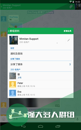 强大的多人群组:200人群组支持管理员权限设置、消息置顶、群公告等功能,让大型团队协作变得井然有序,同时保持高度安全性。
