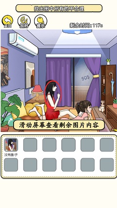 游戏采用经典的找茬玩法,但加入了更多创新元素。玩家需要在限定时间内找出场景中所有不合理的物品,这些物品可能隐藏在背景中或伪装成其他东西。随着关卡推进,难度会逐渐提升,物品隐藏得更加巧妙。游戏还设置了多种挑战模式,包括限时挑战、无限模式和多人对战等,让玩家可以根据自己的喜好选择不同的游戏方式。完成特定任务还能获得额外奖励,大大增加了游戏的可玩性。