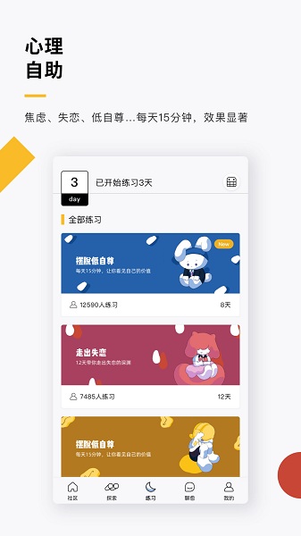 每天15分钟的心理练习,融合了书写、冥想和认知行为疗法(CBT)等多种形式,以轻松有趣的方式帮助用户改善心理状态。平台秉持不评价、信任与关怀的核心价值观,让用户可以放心地分享自己的故事。在这里,你不仅能获得专业的心理分析和建议,还能找到面临相似人生挑战的伙伴,彼此支持、共同成长。从情绪管理到人际关系,从职业发展到家庭问题,月食都能提供针对性的帮助。