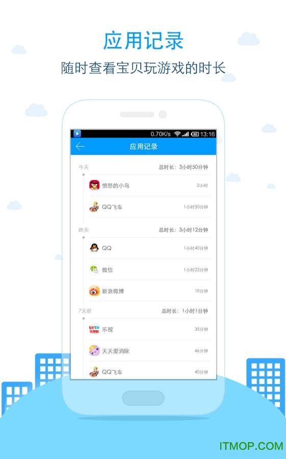 使用记录:查看孩子每天使用iPhone/iPad的时长。支持按周/月生成使用报告,方便家长全面了解使用情况。