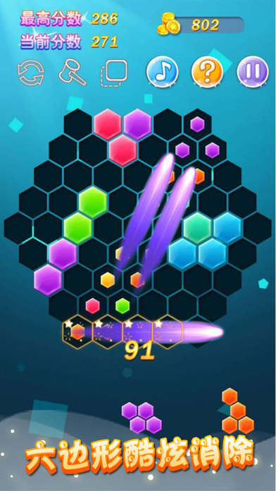 游戏的核心玩法简单而富有策略性,玩家需要通过拖动系统随机给出的三个六边形方块组合,将其中的任意一个放置在棋盘的空白位置。当六边形方块能够完整地排列成一行或多行时,就会触发消除效果并获得分数。随着游戏的进行,棋盘上的可用空间会越来越少,当棋盘上再也无法放置任何方块组合时,游戏就会结束。这种玩法既考验玩家的空间想象能力,又需要合理的规划布局,极具挑战性和趣味性。