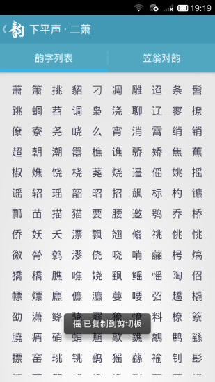 【新增】韵部浏览界面支持滑动选择多个韵字,批量复制功能极大提升了创作效率。新增的收藏夹功能可以保存常用字词组合。