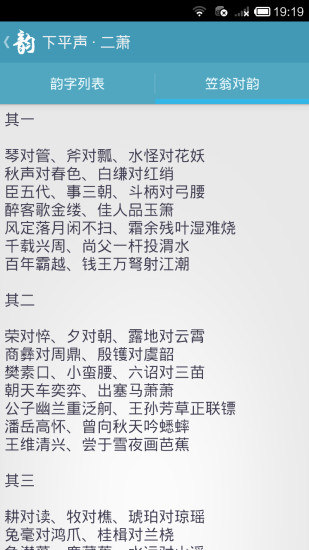 作为古诗词创作的得力助手,本应用深度整合了《诗韵合璧》的韵部体系与《笠翁对韵》的对仗精髓。除了基础的韵字查询功能外,还特别设计了韵部联想、对韵推荐等特色模块,让创作过程更加流畅自然。用户可以通过关键词检索快速找到符合格律要求的字词组合,系统还会智能推荐意境相符的经典对句作为参考,大大降低了古典诗词创作的门槛。