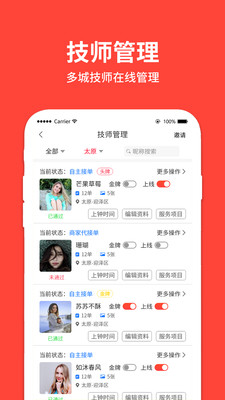 作为专业的按摩行业SaaS解决方案,平台集成订单管理、客户维护、财务统计等全流程功能模块。技师端支持AR实景导航找路功能,内置服务计时器和标准化操作指引。商户管理后台提供员工排班系统、服务品控模板和智能库存管理,可同步管理多个线下门店。特有的服务评价体系包含6大维度20项细分指标,帮助技师持续优化服务质量。