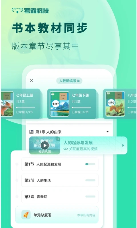 同步跟进课堂进度,按照孩子课前预习课后巩固,同步整理全科知识点背诵,初中生物课堂重点、难点、要点统统拿下,家长无需为孩子课后复习担忧,打开背诵模式,轻松get所有知识点,学习好玩又!系统自动生成知识图谱,将零散知识点串联成体系,帮助学生建立完整的知识框架,实现融会贯通。
