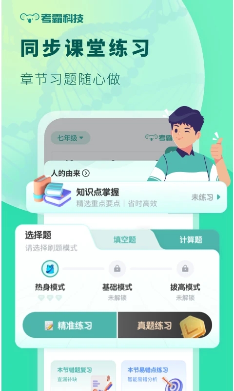 考霸科技智能题库,老师们的优质选择,孩子们复习巩固的品质保障;题库智能总结章节重点,考试难点,历年常考等几大类题型,更结合闯关模式,游戏式做题让孩子爱上学习,爱上刷题~题库内容经过严格审核,确保准确性和权威性,同时根据大数据分析学生薄弱环节,智能推送针对性练习。